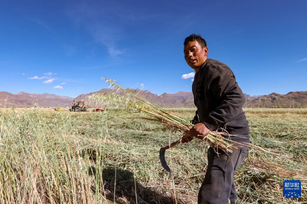 10月24日,拉薩市林周縣強(qiáng)嘎鄉(xiāng)曲嘎強(qiáng)村村民阿旺旦增在自家田壟邊收割牧草。新華社記者 姜帆 攝