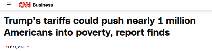 美國有線電視新聞網(wǎng)(CNN)11日?qǐng)?bào)道指出,特朗普政府的關(guān)稅政策在推高聯(lián)邦收入的同時(shí),恐導(dǎo)致顯著的社會(huì)成本。耶魯大學(xué)預(yù)算實(shí)驗(yàn)室最新分析顯示,這一系列政策或使近百萬美國人陷入貧困。