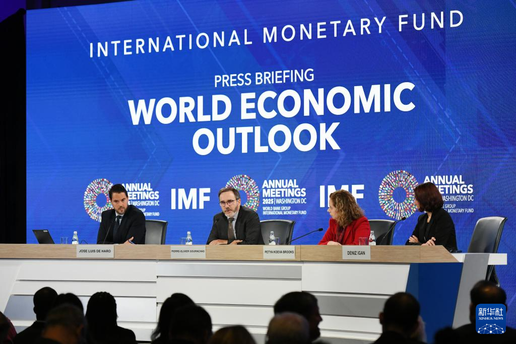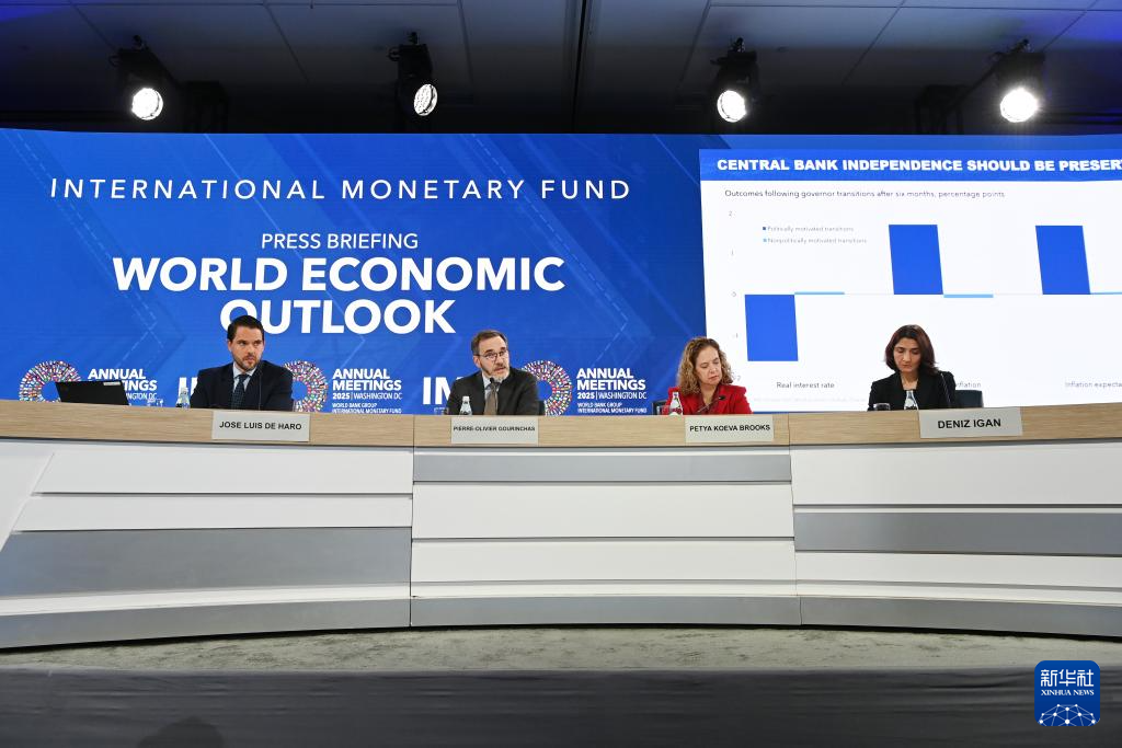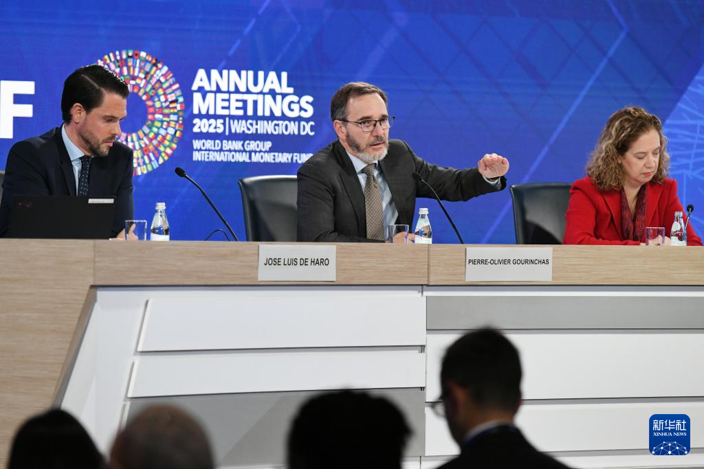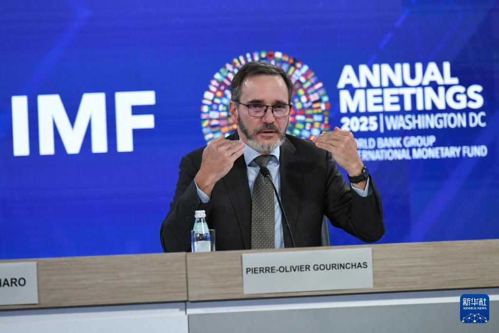 10月14日,在美國(guó)華盛頓,國(guó)際貨幣基金組織首席經(jīng)濟(jì)學(xué)家皮埃爾-奧利維耶·古蘭沙(中)在《世界經(jīng)濟(jì)展望報(bào)告》新聞發(fā)布會(huì)上講話(huà)。新華社記者 李睿 攝