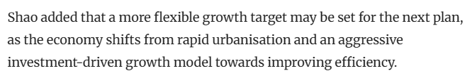 《南華早報》援引分析人士的表述認為,隨著中國經濟從快速城鎮(zhèn)化和投資驅動型增長模式轉向高質量發(fā)展,中國下一個五年規(guī)劃可能會設定更靈活的增長目標。