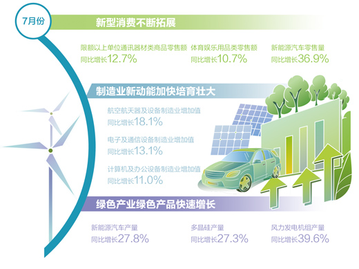 綠色產(chǎn)業(yè)綠色產(chǎn)品快速增長。7月份,新能源汽車產(chǎn)量同比增長27.8%,多晶硅產(chǎn)量同比增長27.3%、風力發(fā)電機組產(chǎn)量同比增長39.6%。
