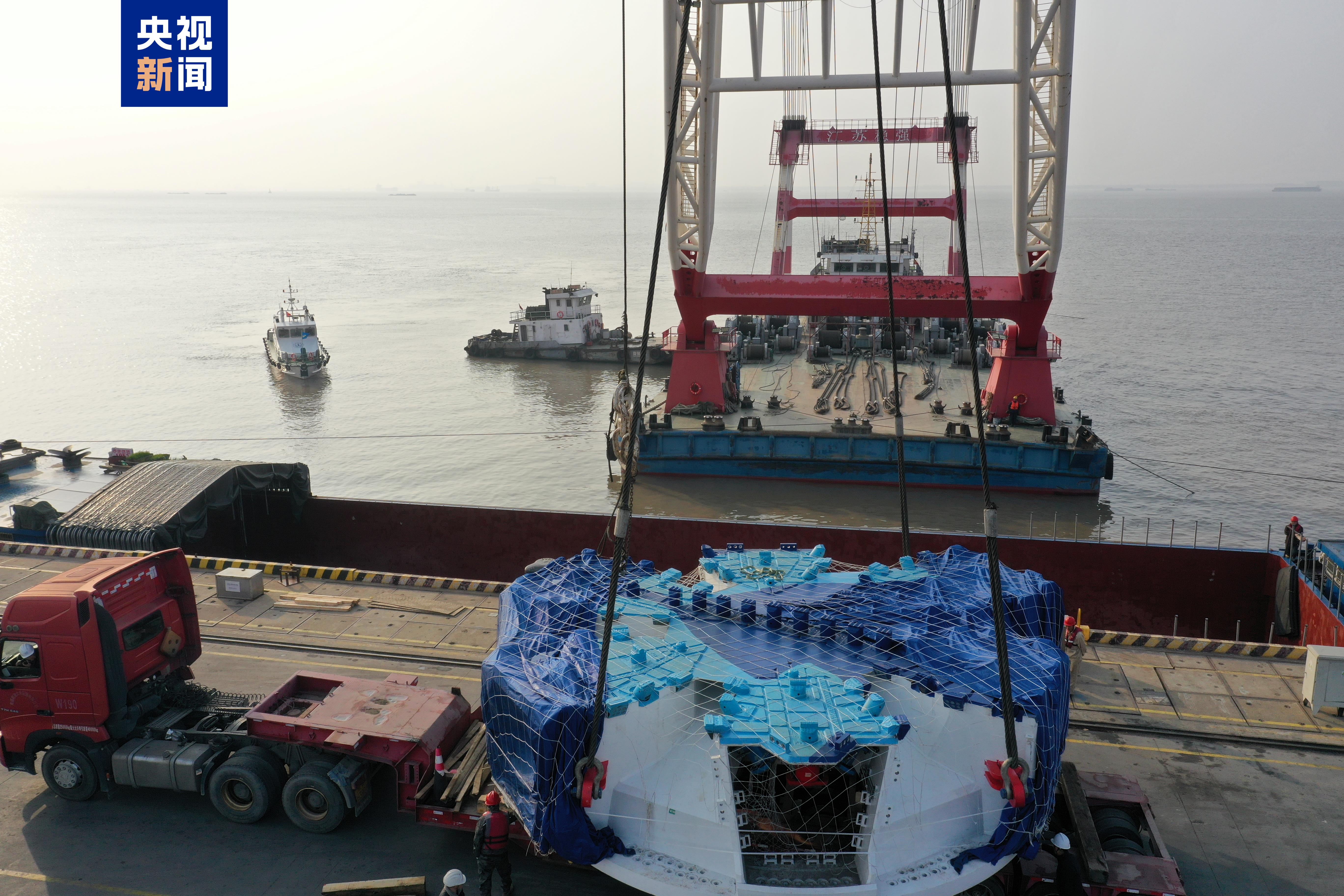 今天(12月3日)9時許,海太長江隧道盾構(gòu)機(jī)“江海號”的刀盤中心塊運(yùn)抵江蘇南通海門吊裝上岸,通過水陸聯(lián)運(yùn)的方式進(jìn)入施工現(xiàn)場。
