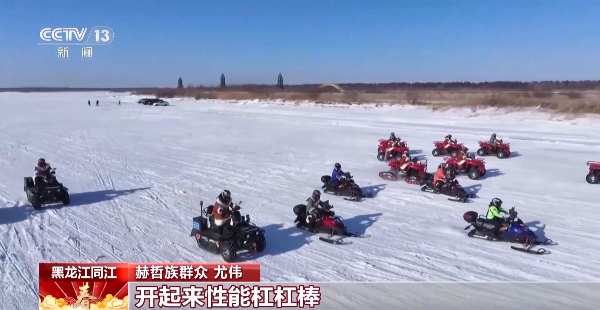 赫哲族群眾 尤偉:都以為赫哲族不以漁獵為主嘛,后期生活水平提高了,這款雪地摩托車是我們廠自己研發(fā)的,開起來性能杠杠棒。作為我們騎手來說,心情可好可棒了。