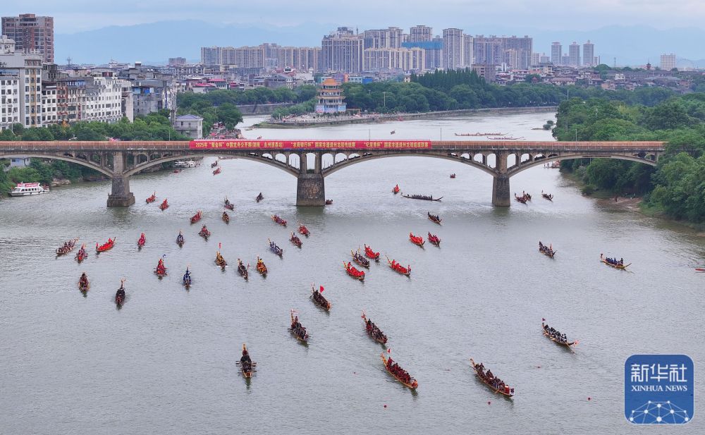 5月22日,龍船在湖南省永州市道縣縣城瀟水河面劃行備戰(zhàn)(無(wú)人機(jī)照片)。新華社發(fā)(何紅福攝)