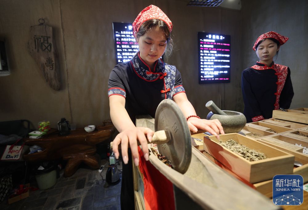 5月24日,在山東省臨沂市沂南縣銅井鎮(zhèn)竹泉村,傳統(tǒng)手工藝人在搗碎中藥材,準(zhǔn)備制作香囊。新華社發(fā)(王彥冰攝)