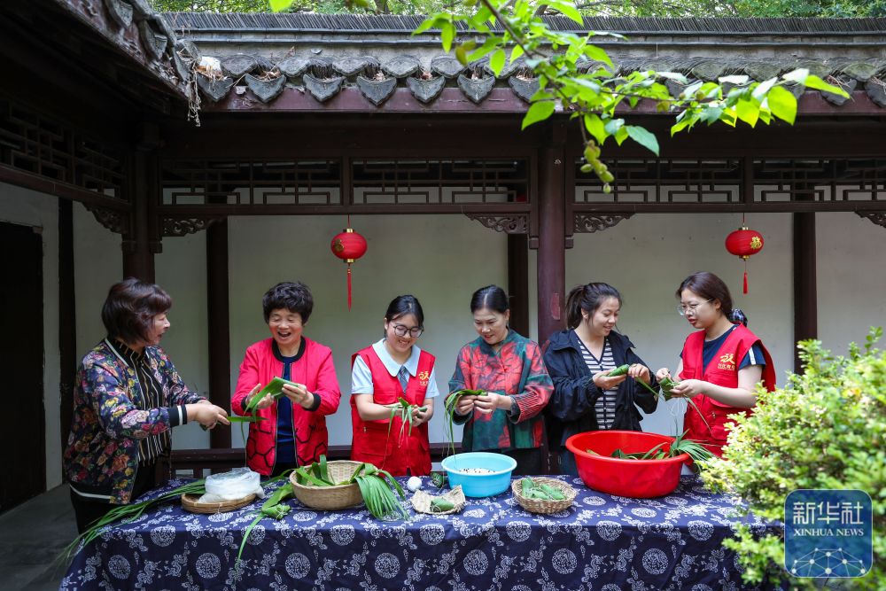 5月24日,在位于江蘇省興化市昭陽(yáng)街道的興化書(shū)院,青年志愿者和社區(qū)居民一起包粽子。新華社發(fā)(周社根攝)