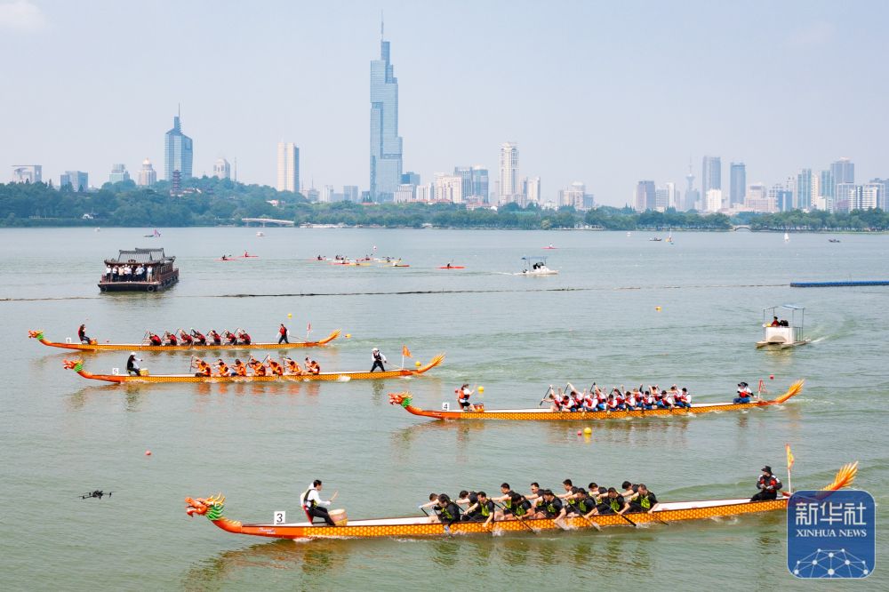 5月24日,龍舟隊(duì)伍在南京玄武湖上競(jìng)逐(無(wú)人機(jī)照片)。新華社發(fā)(蘇陽(yáng)攝)