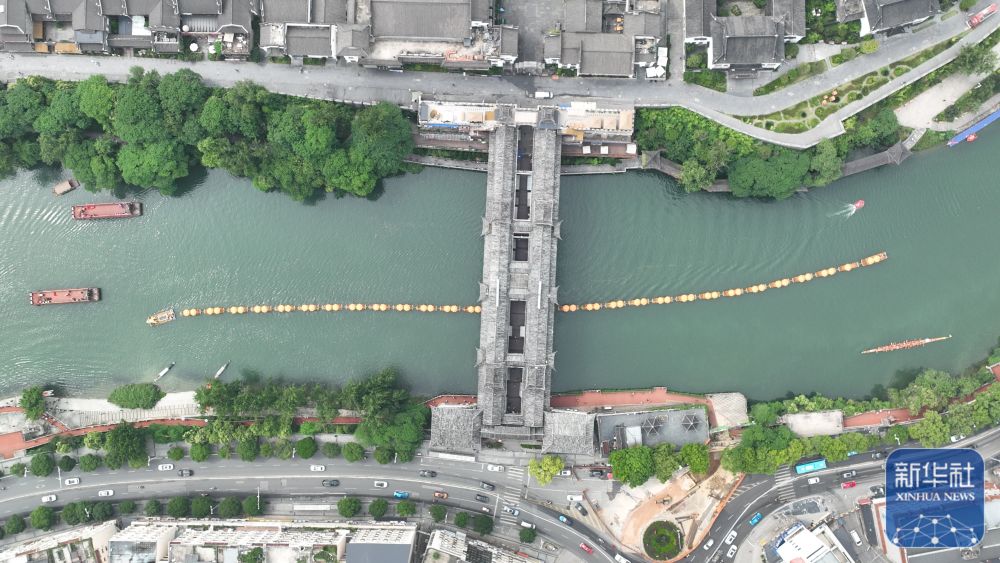 5月24日,在貴州省銅仁市碧江區(qū)錦江水域,觀光龍舟從風(fēng)雨橋下穿過(guò)(無(wú)人機(jī)照片)。新華社發(fā)(申逸愷攝)