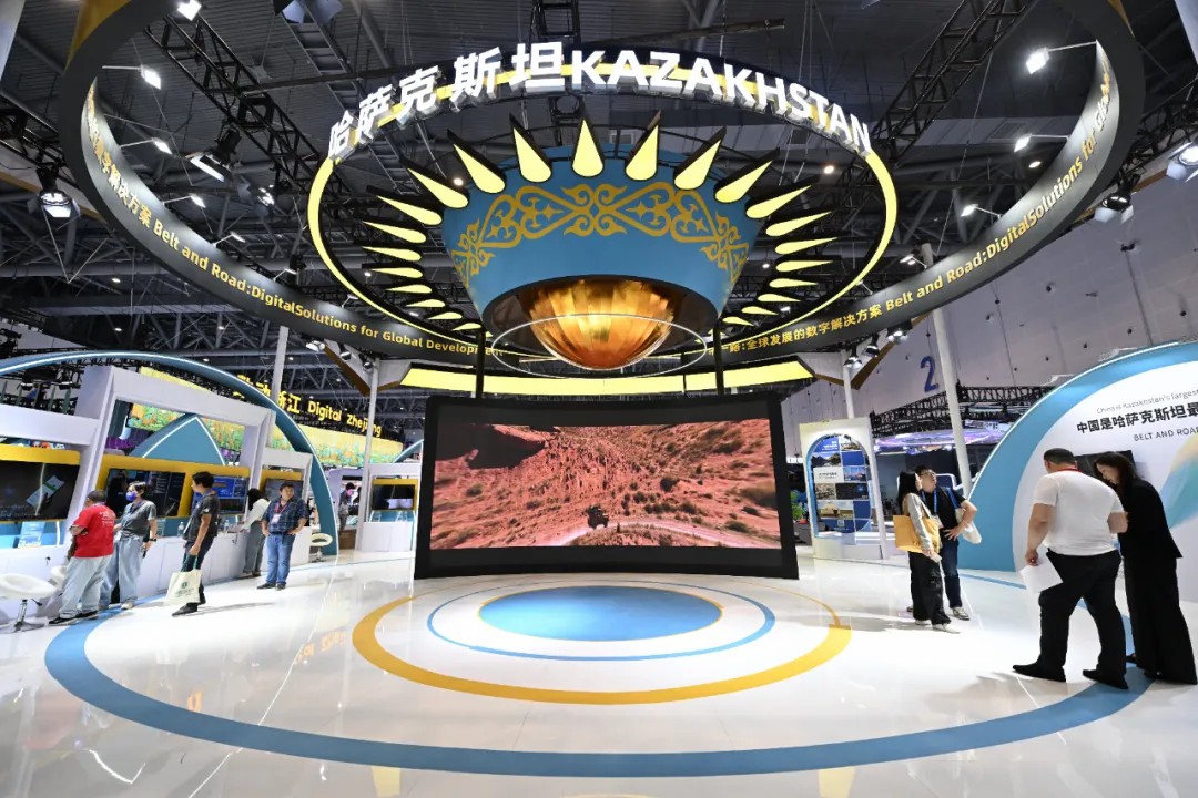 2024年9月24日,在杭州舉行的第三屆全球數(shù)字貿(mào)易博覽會上哈薩克斯坦展區(qū)吸引參觀者參觀。中新社記者王剛 攝