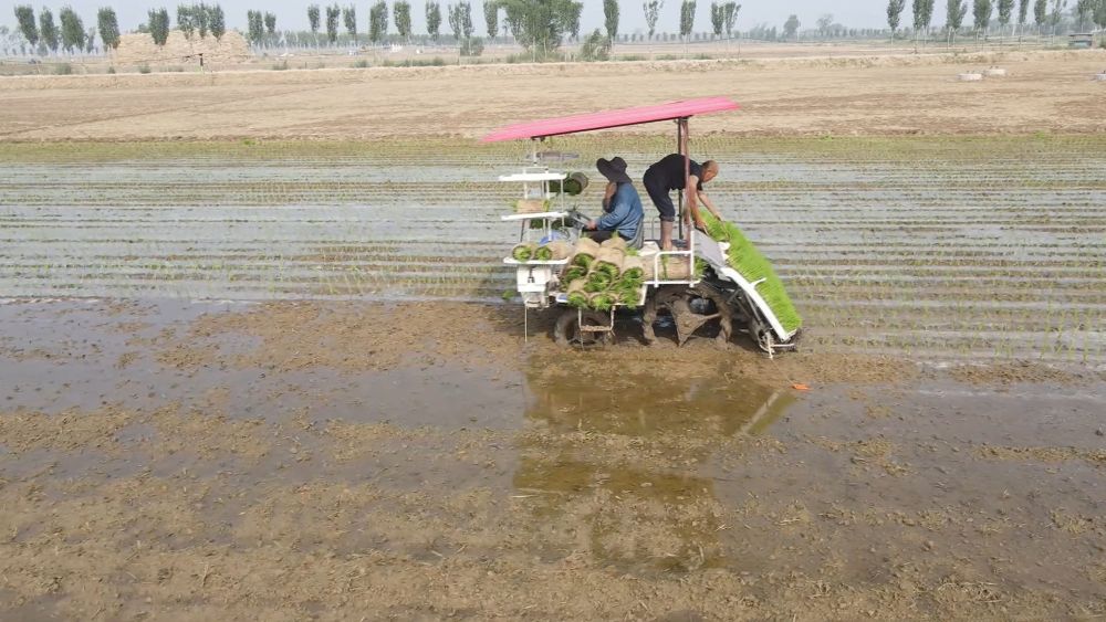 在河南省新鄉(xiāng)市原陽(yáng)縣太平鎮(zhèn),種植戶們?cè)诓逖頇C(jī)的助力下,搶抓農(nóng)時(shí),進(jìn)行水稻插秧。受訪者供圖