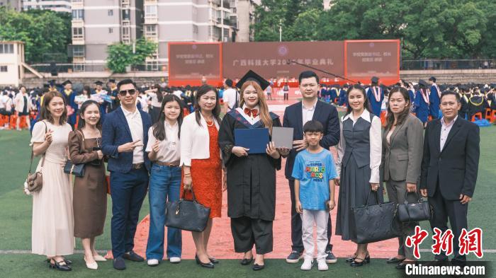 在廣西科技大學(xué)27日舉行的畢業(yè)典禮上,老撾留學(xué)生馬麗文成為全場(chǎng)焦點(diǎn):她的父母、兄弟等十位親人跨國(guó)而來,見證這一重要時(shí)刻。“當(dāng)家人手捧鮮花向我走來,我緊緊擁抱住他們,感謝他們支持我的夢(mèng)想?!瘪R麗文說。