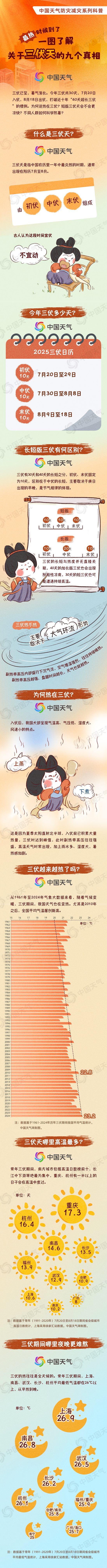 今天(7月20日),我國正式入伏,意味著一年中最熱的時候來了。今年為30天短版三伏,打破了近十年“40天超長三伏”的慣例。為何說熱在三伏?短板三伏天會不會更涼快?不同人群如何科學(xué)防暑?中國天氣網(wǎng)推出防災(zāi)減災(zāi)系列科普,一圖了解關(guān)于三伏天的9個真相。