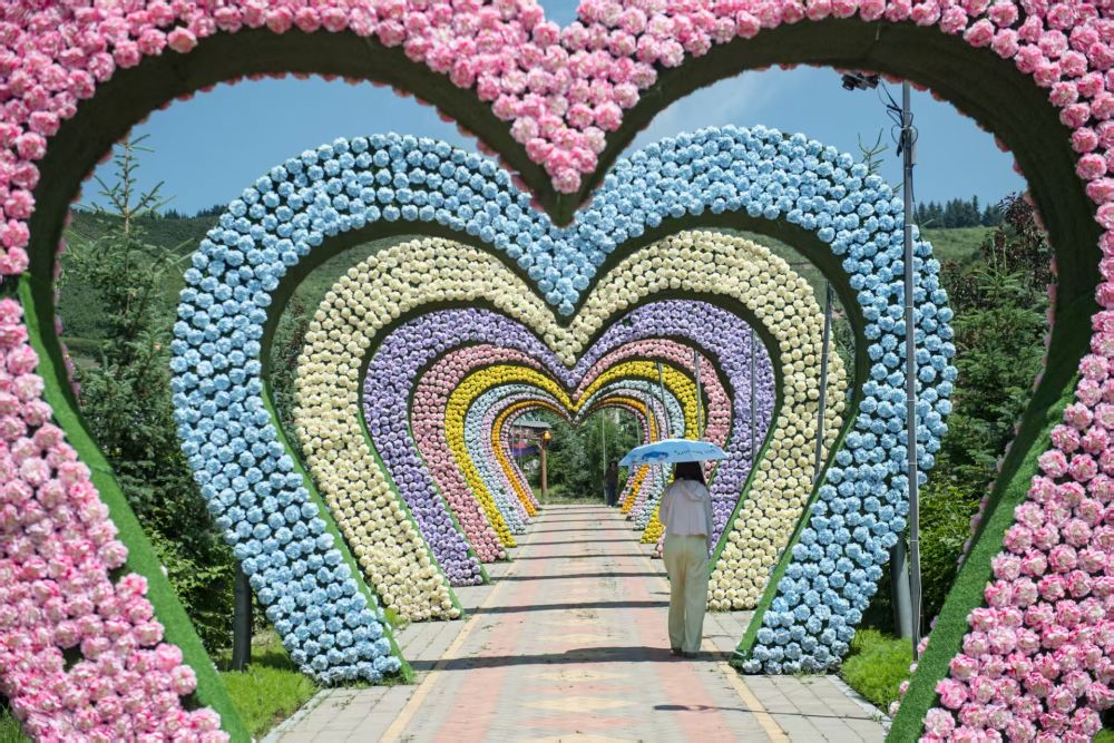 7月22日,在青海省大通縣邊麻溝花海景區(qū),一名游客經(jīng)過鮮花長(zhǎng)廊。新華社記者 孫瑞博 攝