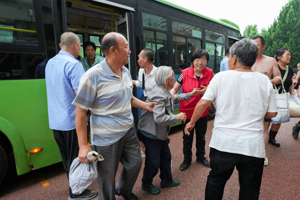 7月27日,在北京市密云區(qū)石城鎮(zhèn)中心小學(xué)安置點(diǎn),受災(zāi)群眾乘坐大巴轉(zhuǎn)運(yùn)車(chē)抵達(dá)安置點(diǎn)。新華社記者 鞠煥宗 攝