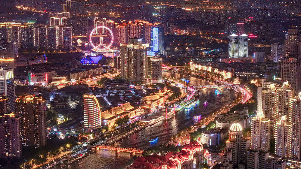 夜幕降臨,海河兩岸璀璨絢麗、千變萬化:高層建筑披上燈光外衣,勾勒出兩岸高低協(xié)調、錯落有致的天際線;跨越在海河兩岸的座座橋梁,如長虹臥波、玉帶蜿蜒;游人排隊乘坐永樂橋“天津之眼”摩天輪,座艙升至最高處,可將大半座城市的繁華盡收眼底……