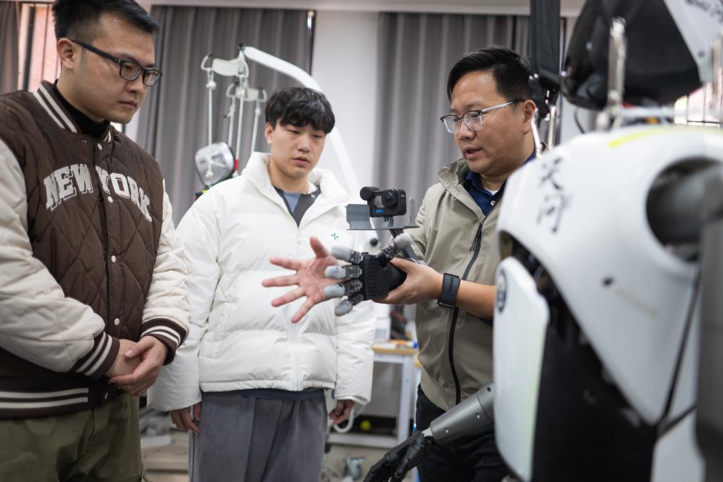 武漢大學(xué)研發(fā)團(tuán)隊(duì)在對(duì)“天問(wèn)”人形機(jī)器人進(jìn)行調(diào)試。新華社記者肖藝九 攝