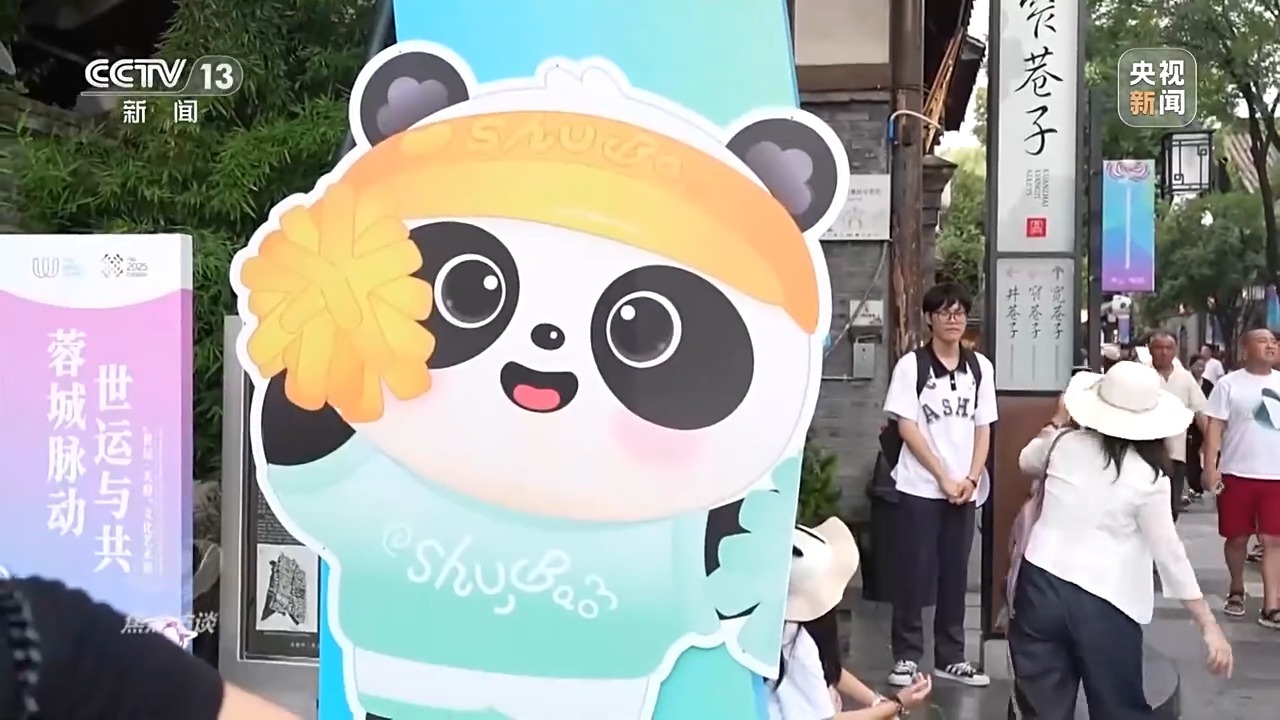 成都寬窄巷子依托世運吉祥物“蜀寶”“錦仔”變身世運主題街,世運吉祥物,搭配主題打卡墻、沿街形象架等氛圍裝置,生動展現(xiàn)“世運雙寶”可愛形象。在寬窄巷子,還專門設(shè)置了“世運 天府”文化藝術(shù)展。