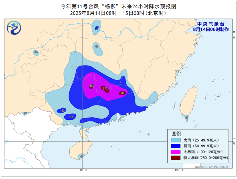預計,8月14日08時至15日08時,廣東大部、廣西大部、福建東南部、江西南部、湖南中南部和西北部、貴州東部等地有大到暴雨,部分地區(qū)大暴雨,其中,廣東北部、廣西東北部、湖南南部、江西西南部等地局地有特大暴雨(250~280毫米)。上述部分地區(qū)伴有短時強降水(最大小時降雨量20~50毫米,局地可超過70毫米),局地有雷暴大風等強對流天氣。