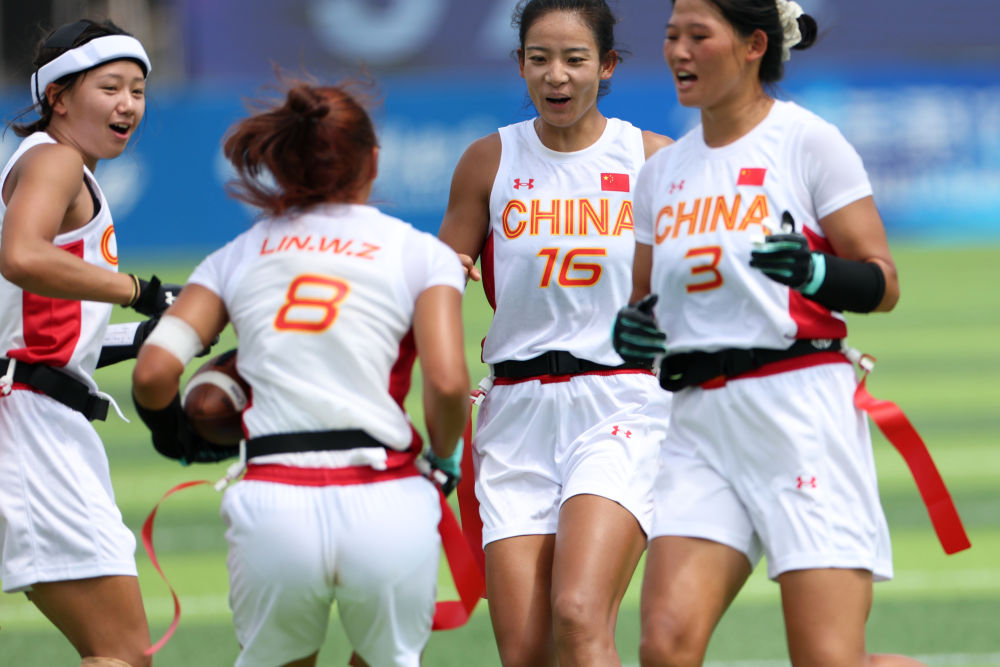 8月14日,在2025年成都世運會腰旗橄欖球女子預賽A組比賽中,中國隊45:47不敵奧地利隊。圖為中國隊球員慶祝得分畫面。新華社記者 陳斌 攝