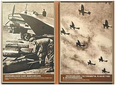 中國人民抗日戰(zhàn)爭紀(jì)念館中展示的蘇聯(lián)援華航空隊(duì)老照片。左側(cè)照片為蘇聯(lián)援華航空隊(duì)成員為飛機(jī)裝彈,準(zhǔn)備轟炸被日軍占領(lǐng)的臺北松山機(jī)場。右側(cè)照片為1938年中蘇空軍參加徐州會(huì)戰(zhàn)。