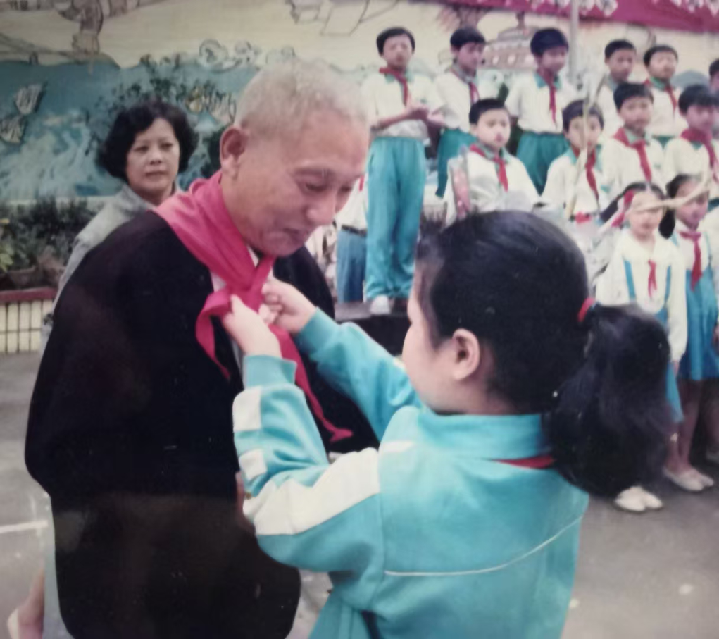 ↑在鄱陽街小學演講活動期間,學生為李德富系紅領(lǐng)巾