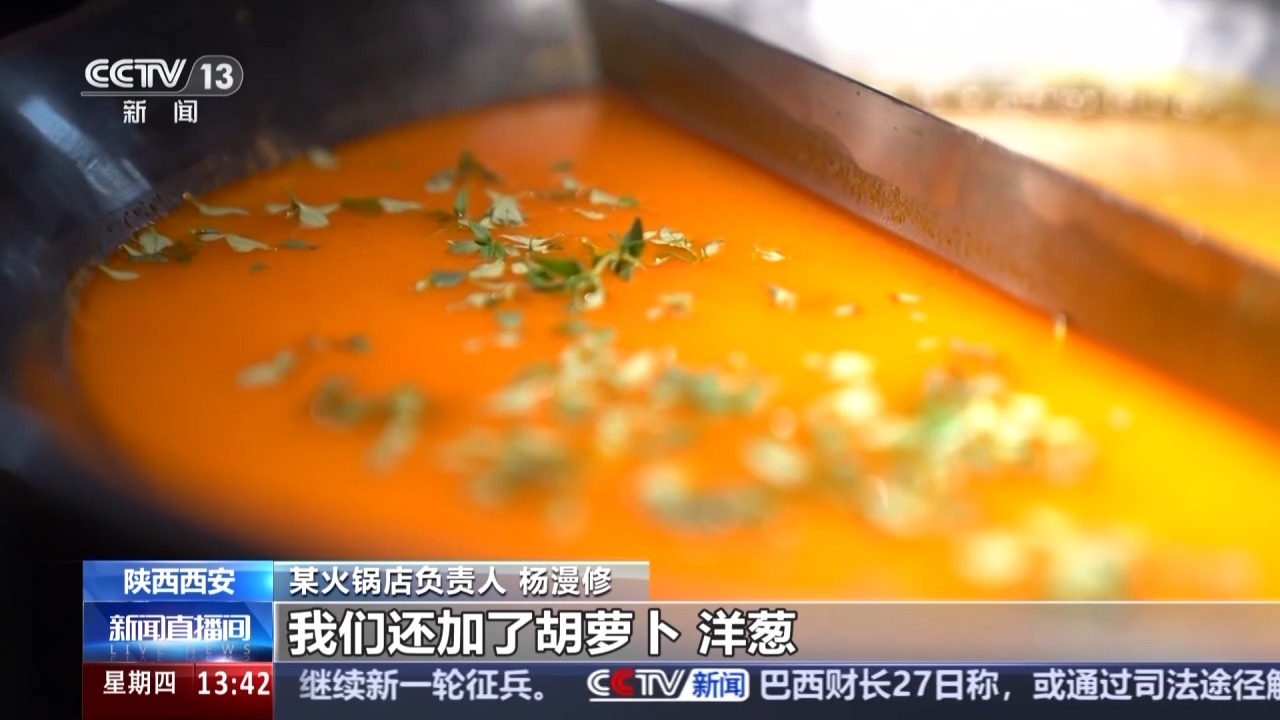 某火鍋店負(fù)責(zé)人 楊漫修:我們這個(gè)番茄鍋更像是西餐里面的番茄濃湯,比如說我們?cè)谧隽系臅r(shí)候除了番茄以外,我們還加了胡蘿卜、洋蔥、歐芹、百里香。