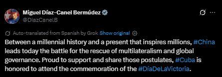 迪亞斯-卡內(nèi)爾在社交媒體上發(fā)文稱,“在綿延千年的歷史與激勵億萬人的當(dāng)下之間,中國今日引領(lǐng)捍衛(wèi)多邊主義與全球治理的斗爭。古巴為支持并踐行這些理念而自豪,并榮幸出席勝利日紀念活動?!?/p>