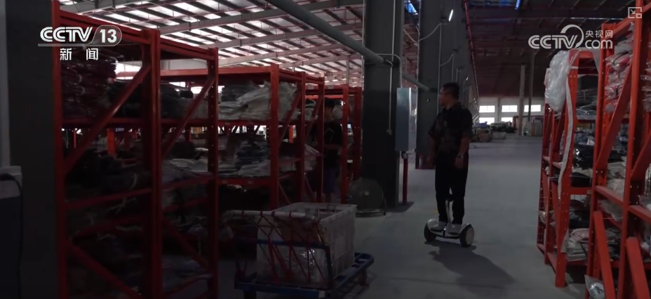 當記者在天門服裝產業(yè)園里碰到費文的時候,他正騎著電動平衡車在庫房的貨架之間來回穿梭。