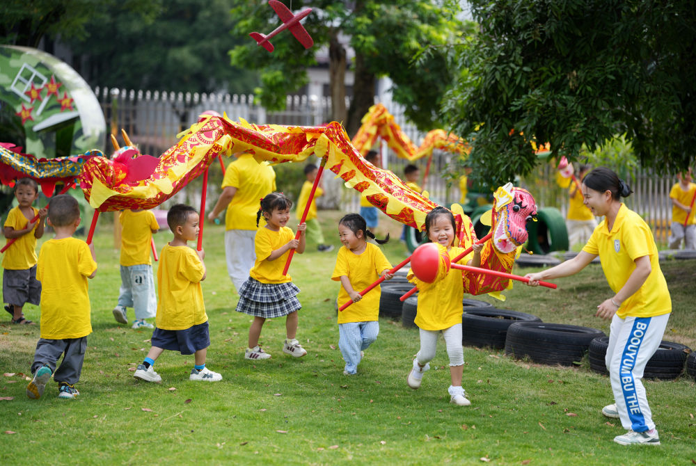 9月5日,四川瀘州白酒產業(yè)園區(qū)天驕托育園的老師帶領孩子們舞龍。新華社記者 江宏景 攝