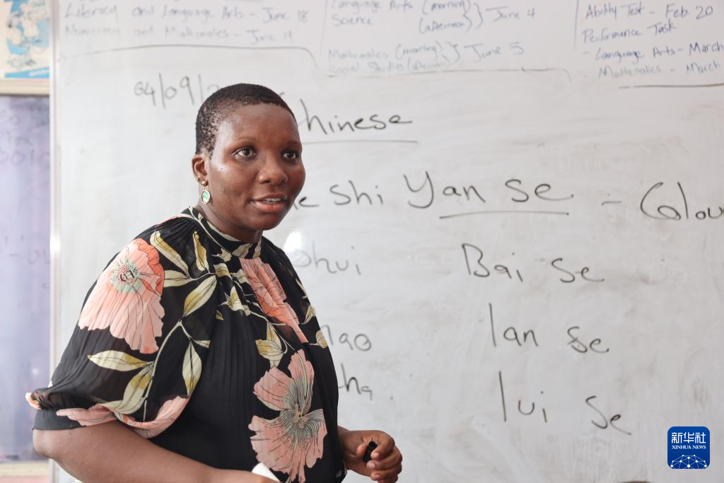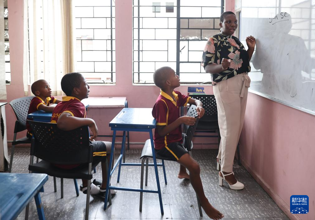 在牙買加首都金斯敦的一間教室里,艾特特殊教育小學校長娜塔莎·拉塞爾在黑板上書寫著與顏色相關(guān)的漢字,孩子們端坐在椅子上,跟隨她輕聲朗讀。教室里時而響起整齊的讀書聲,時而響起輕快的中文歌曲旋律。