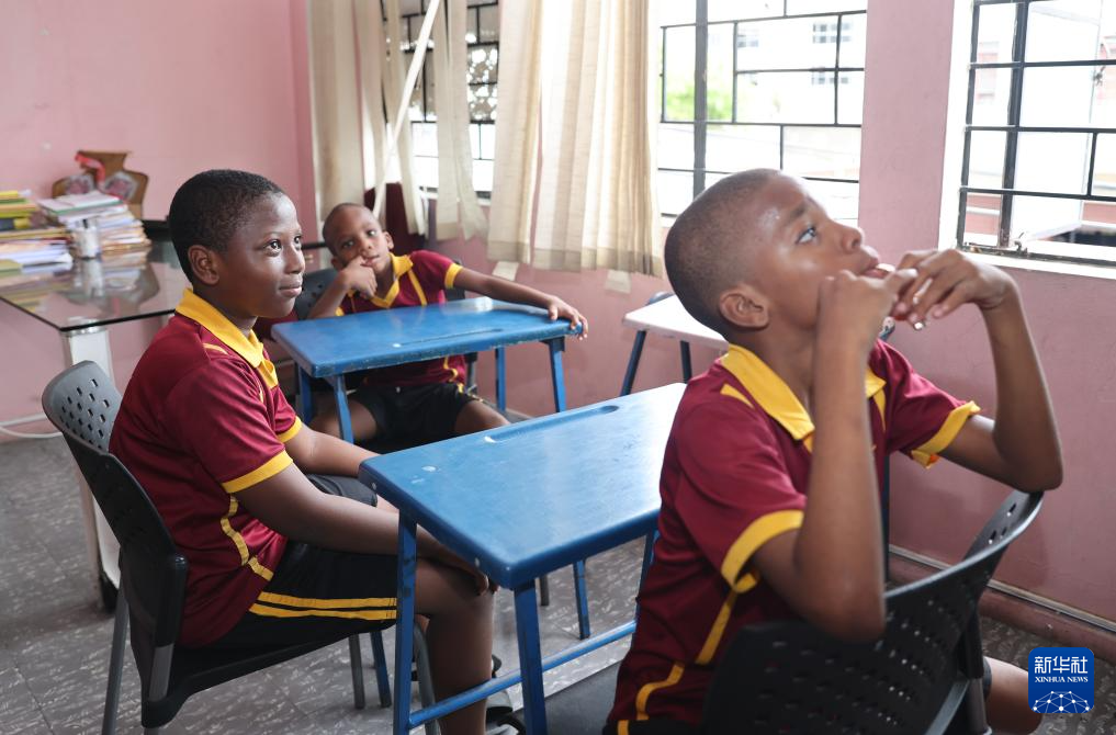 9月4日,在牙買加首都金斯敦艾特特殊教育小學,老師帶領(lǐng)學生唱歌。新華社記者 李夢馨 攝