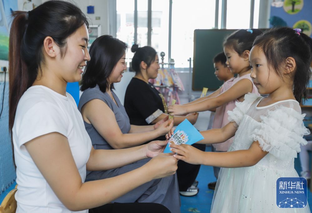9月9日,河北省遵化市遵化鎮(zhèn)南關(guān)幼兒園的小朋友給老師送賀卡,祝福教師節(jié)。新華社發(fā)(劉滿(mǎn)倉(cāng)攝)