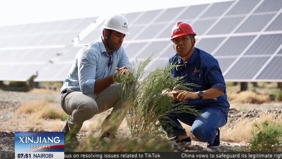 外籍主持人林肯探訪了全球最大的“草光互補(bǔ)”光伏基地——阿合雅光伏產(chǎn)業(yè)園。這片由181萬(wàn)塊光伏板組成的藍(lán)色海洋,占地493公頃,相當(dāng)于700個(gè)標(biāo)準(zhǔn)足球場(chǎng)。不僅能夠提供滿足約43萬(wàn)人全年用電需求,還兼具治沙功效。中國(guó)華能集團(tuán)烏什光伏電站負(fù)責(zé)人周博表示,這類(lèi)光伏設(shè)施能夠穩(wěn)固土壤、防止侵蝕,板面凝結(jié)的水珠還可灌溉下方土地,支持植物持續(xù)生長(zhǎng)。“戈壁奇跡”的背后,是國(guó)家實(shí)現(xiàn)“雙碳”目標(biāo)而推動(dòng)的生態(tài)與能源的“雙向奔赴”。