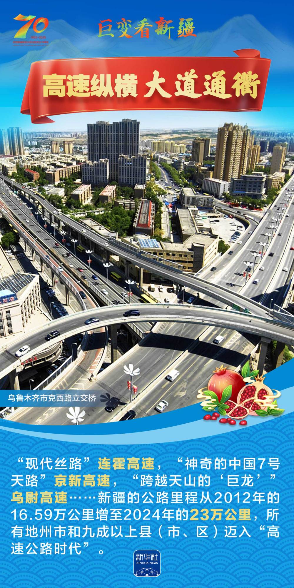 今年是新疆維吾爾自治區(qū)成立70周年。70年來,新疆的交通建設日新月異。從駝鈴聲聲、馬蹄嘚嘚到鐵流縱橫、銀鷹高翔,一座座交通樞紐輻射四方,一條條“鋼鐵巨龍”蜿蜒逶迤,一個個支線機場星羅棋布,現(xiàn)代化的新疆立體交通網(wǎng)絡日益形成。讓我們跟隨這組海報,一起見證穿越“三山兩盆”、貫通歐亞大陸的新時代新疆交通畫卷。
