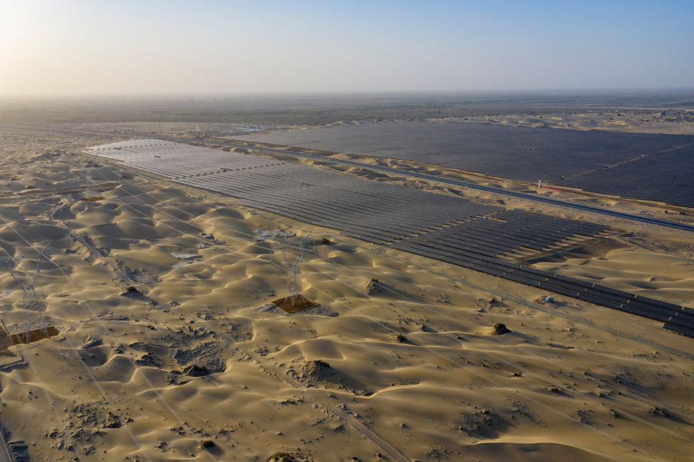 9月22日在新疆巴音郭楞蒙古自治州若羌縣拍攝的中國綠發(fā)新疆中綠電若羌400萬千瓦光伏項目(無人機照片)。該項目每年可發(fā)電69.08億千瓦時,滿足南疆200萬戶家庭用電需求,減排208.24萬噸煤耗。