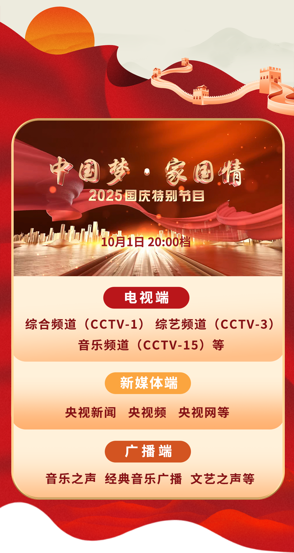 金秋潑彩山河醉,家國同輝氣象新。10月1日晚八點,《中國夢 家國情——2025國慶特別節(jié)目》將在《我愛你中國》的大合唱中拉開大幕。特別節(jié)目走進城市地標(biāo)與文化遺址,展現(xiàn)山河新貌與奮斗者群像。經(jīng)典曲目、交響合唱、新創(chuàng)歌曲傳遞濃濃家國情懷??箲?zhàn)老兵、奧運冠軍、各行各業(yè)奮斗者深情講述……整場節(jié)目,洋溢著中華民族偉大復(fù)興勢不可擋的壯志豪情。