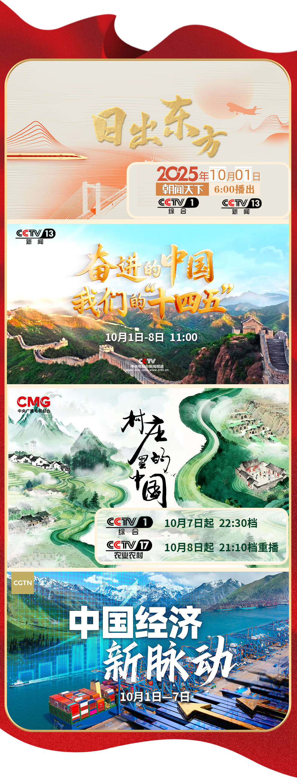 新時代中國的動人故事里,主角正是新征程上奮進的你我。在雄壯的國歌聲中,跟隨特別報道《日出東方》,領(lǐng)略祖國山川的壯麗秀美,看晨曦中的中國人奮力拼搏的“此時此刻”。直播特別節(jié)目《奮進的中國 我們的“十四五”》《向祖國報告》《團結(jié)奮斗向復(fù)興》,全景展示中國式現(xiàn)代化建設(shè)成就。走進《村莊里的中國》飽覽鄉(xiāng)村振興和美畫卷,走遍《可愛的中國》感受身邊的美好生活。走出國門,在全球化視野中,觸摸《中國經(jīng)濟新脈動》。