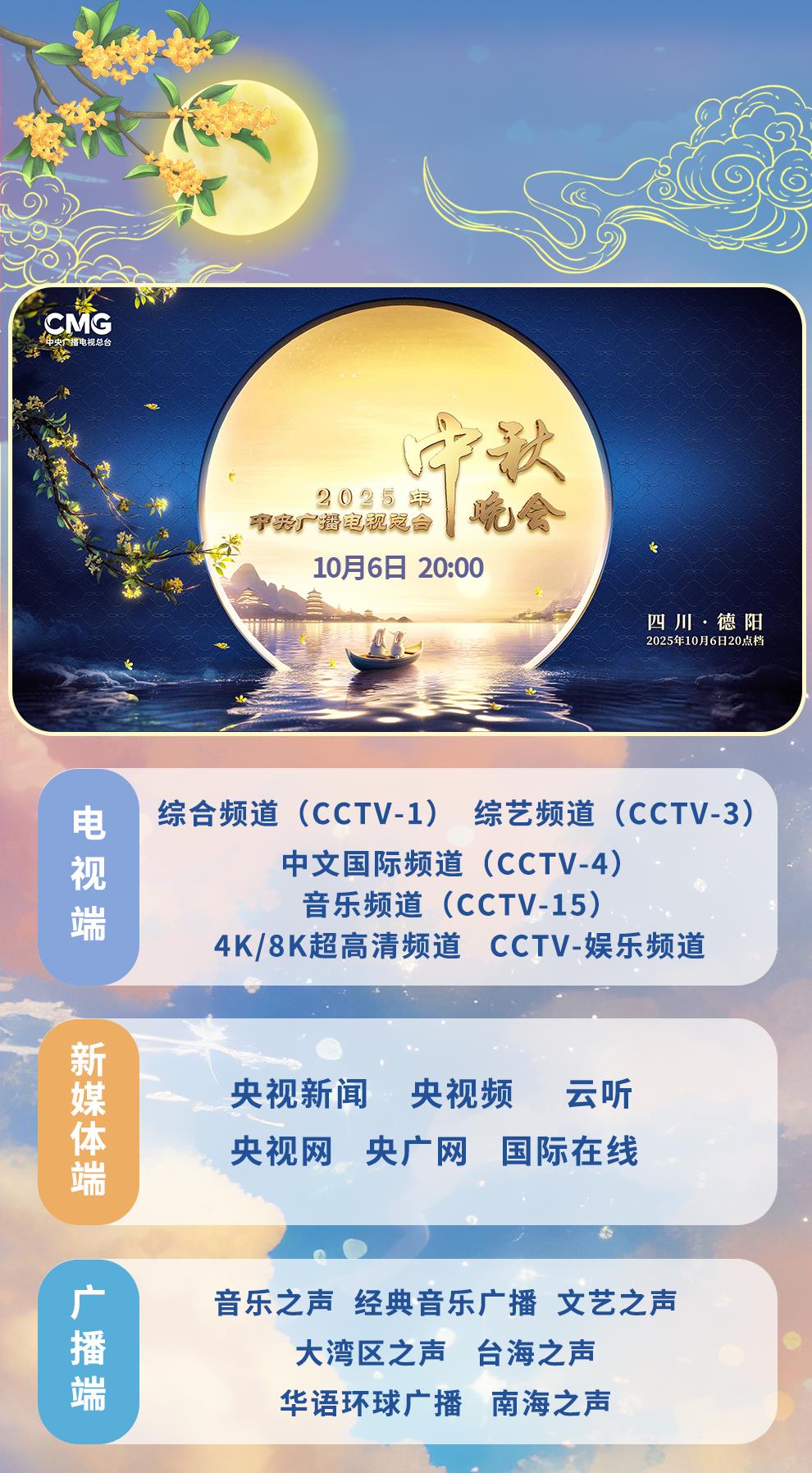 月照古今,共敘團圓。《中央廣播電視總臺2025年中秋晚會》主舞臺選址四川德陽玄珠湖,以蜀道、明月、山水營造“月從蜀道升,人向鏡中圓”的唯美意境。《山月滿》《是吾鄉(xiāng)》《一輪秋》三個篇章,創(chuàng)新視聽語言呈現(xiàn)三星堆的神秘古韻、智能制造的硬核力量、非遺樂器的悠遠回響,為全球受眾奉獻一場巴蜀大地文化與中秋團圓意蘊交織相融的“團圓盛宴”。央視新聞、央視頻推出“秋晚探班”相關(guān)產(chǎn)品,帶你“打卡”錄制現(xiàn)場,“解鎖”臺前幕后。