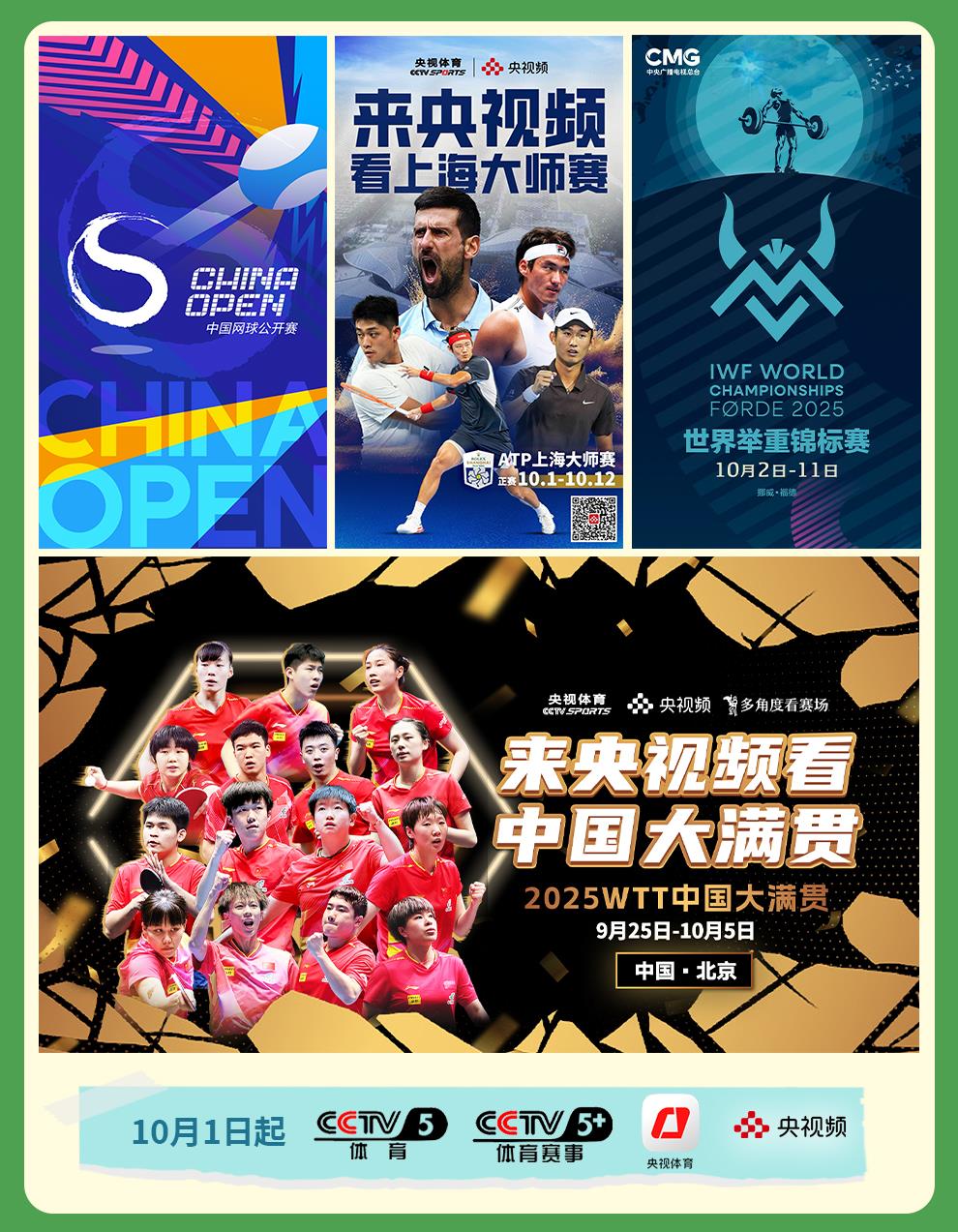 精彩賽事,激情無限!《2025年中國網(wǎng)球公開賽》《2025年世乒聯(lián)大滿貫賽(中國站)》《2025年ATP1000男子網(wǎng)球大師賽(上海賽)》《2025年世界舉重錦標(biāo)賽》等黃金賽事接連開賽,讓體育迷暢享運動的無窮魅力。