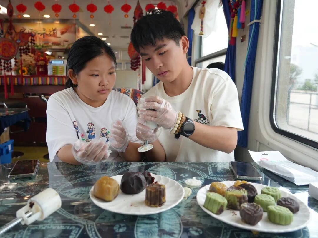 除了歌舞與燈謎,列車工作人員還精心準(zhǔn)備了互動(dòng)體驗(yàn)環(huán)節(jié)。旅客圍坐在一起,親手制作月餅、拼裝手工燈籠。工作人員還為參與活動(dòng)的旅客送上書簽,大家提筆寫下對(duì)家人的中秋祝愿,字里行間滿是牽掛與祝福。活動(dòng)尾聲,身著漢服的列車工作人員端來一盤香甜的滇式月餅,邀請(qǐng)旅客品嘗。