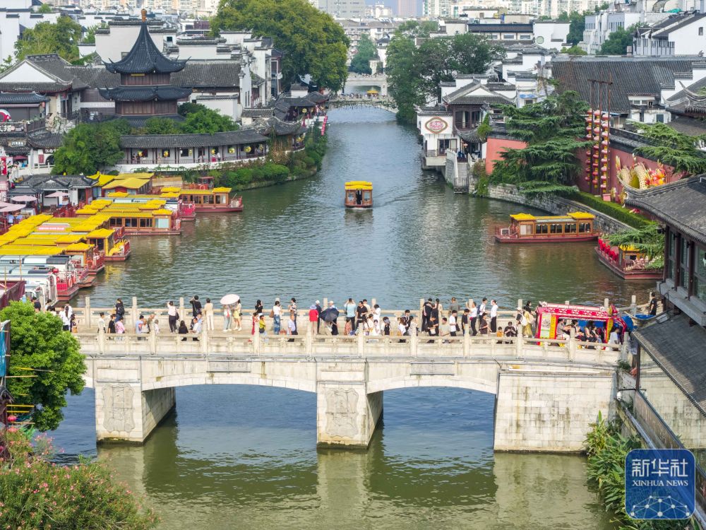 ↑ 10月6日,游客在江蘇省蘇州市吳江區(qū)同里古鎮(zhèn)游覽(無(wú)人機(jī)照片)。新華社發(fā)(周社根攝)
