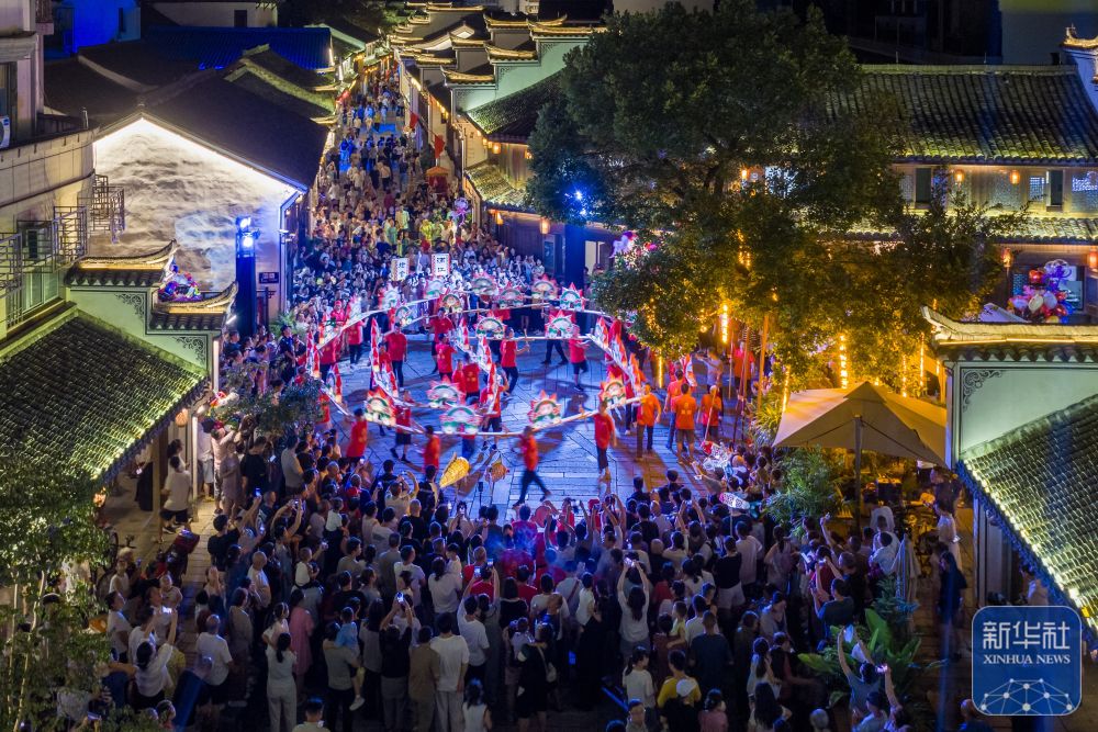 ↑ 10月5日,游客在浙江省浦江縣東街歷史文化街區(qū)欣賞板凳龍巡游(無(wú)人機(jī)照片)。新華社發(fā)(張輝攝)