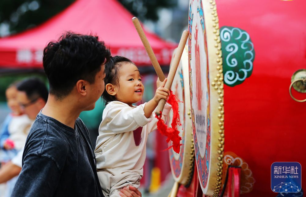 ↑ 10月6日,在山東省滕州漢畫像石館門外,家長(zhǎng)陪著孩子體驗(yàn)擊鼓。新華社發(fā)(李志軍攝)