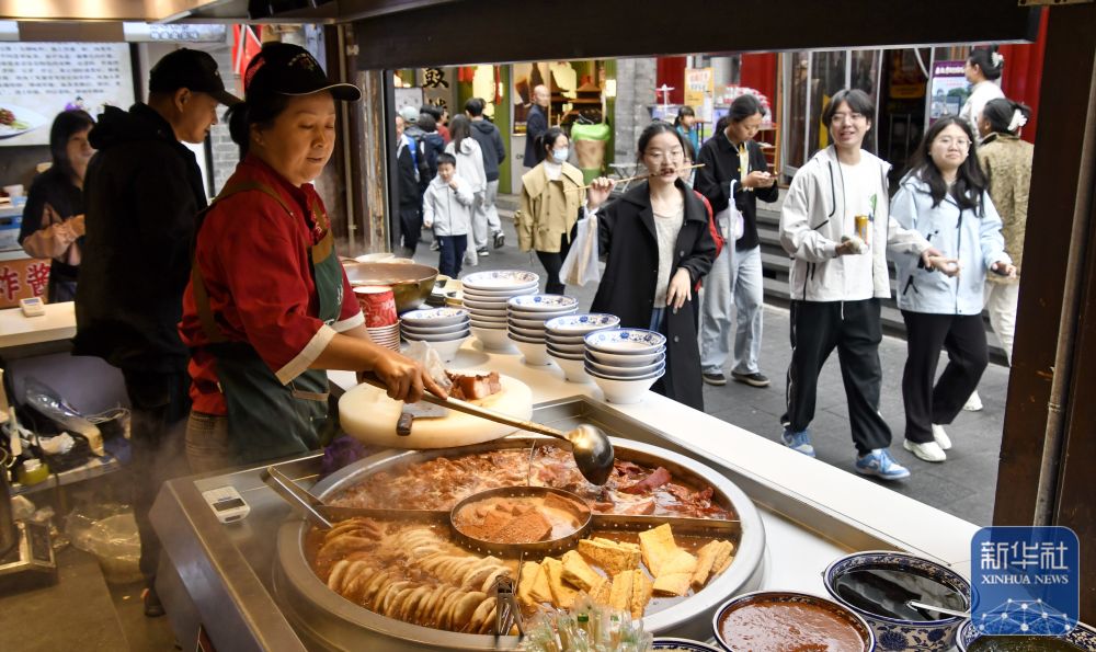 ↑ 10月6日,游客在北京煙袋斜街品嘗美食。新華社記者 李欣 攝