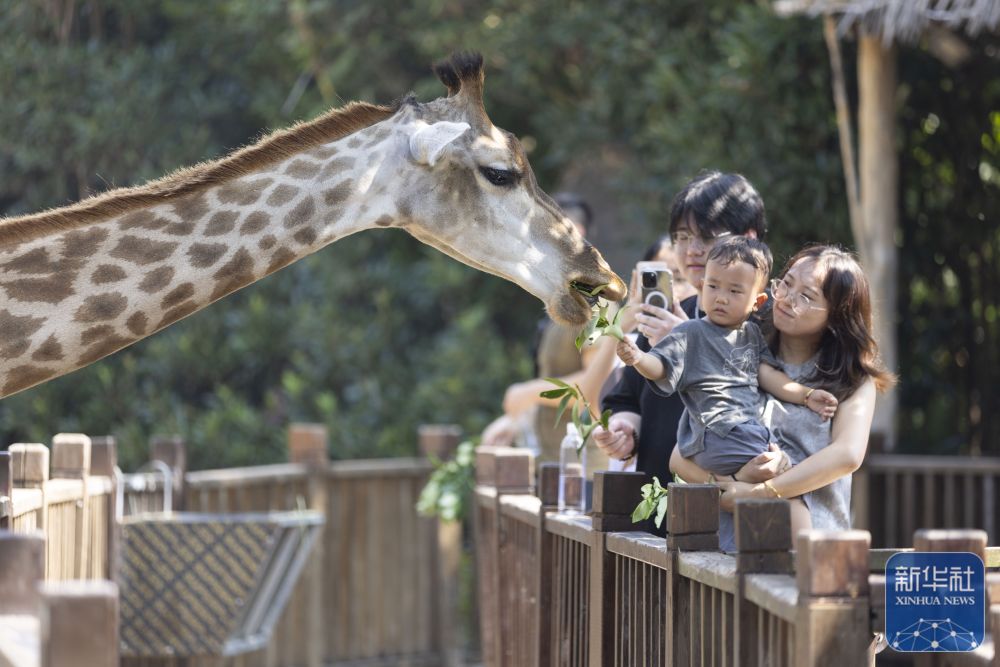 ↑ 10月6日,小朋友在上海野生動(dòng)物園與長(zhǎng)頸鹿互動(dòng)。新華社記者 王翔 攝