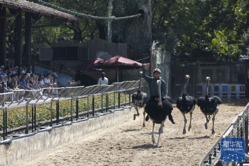 ↑ 10月6日,人們?cè)谏虾R吧鷦?dòng)物園觀看奔跑中的鴕鳥(niǎo)。新華社記者 王翔 攝