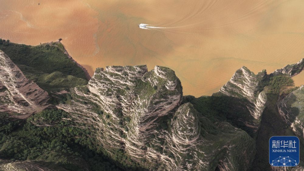 ↑ 10月6日,游客乘船在甘肅炳靈丹霞國(guó)家地質(zhì)公園游覽(無(wú)人機(jī)照片)。新華社發(fā)(史有東攝)