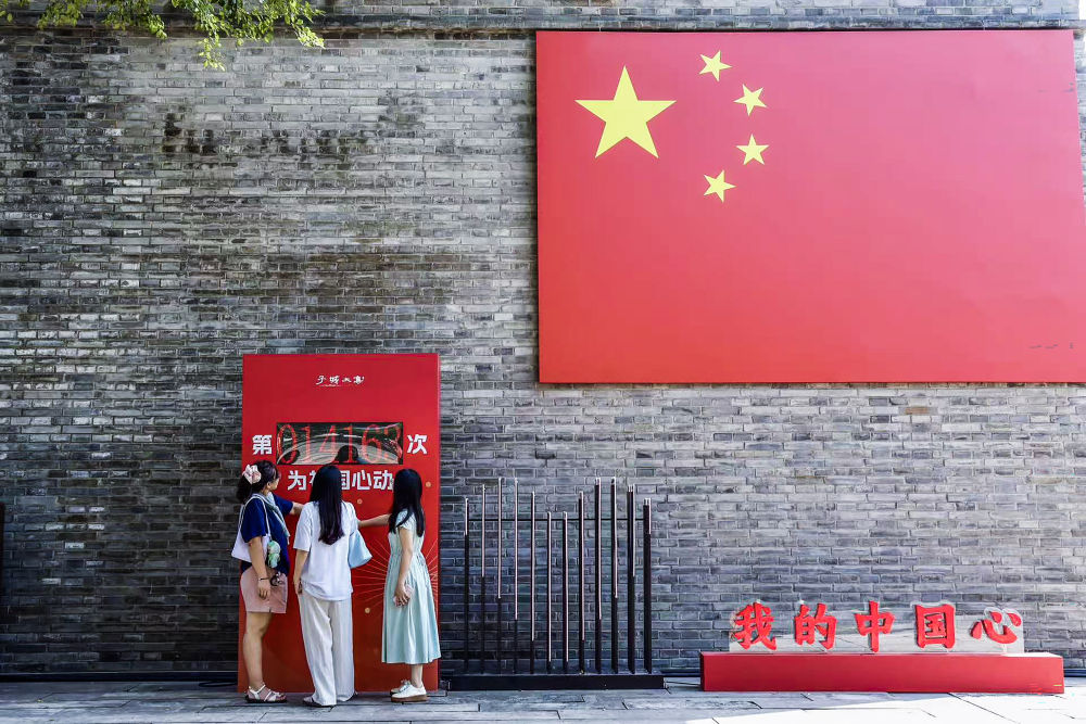 10月1日,在浙江嘉興市南湖區(qū)建設(shè)街道子城城墻邊,市民參加我為祖國(guó)心動(dòng)打卡活動(dòng)。新華社記者 徐昱 攝