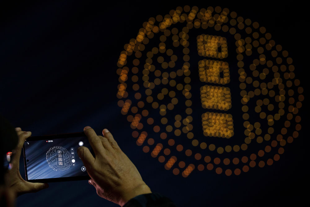 10月6日,游客在黑龍江哈爾濱冰雪大世界園區(qū)拍攝無(wú)人機(jī)表演。新華社記者 張濤 攝