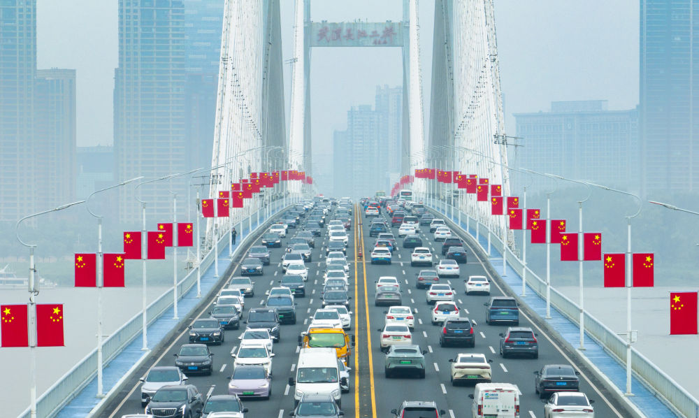 國(guó)慶假期第一天,各地迎來(lái)出行高峰。這是車輛行駛在湖北省武漢長(zhǎng)江二橋上(無(wú)人機(jī)照片,10月1日攝)。新華社記者 肖藝九 攝